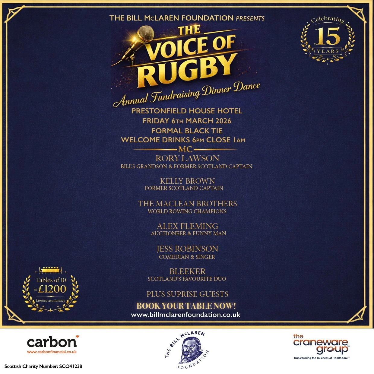 Our annual Voice of Rugby Dinner will be taking place on Friday 6th March, 2026, in the opulent surroundings of Prestonfield House. On the eve of Scotland v France, we have a fantastic line-up of entertainment and special guests, skilfully guided by our resident MC Rory Lawson. Our guest speakers are Edinburgh’s World Record Rowing siblings The Maclean Brothers and Scottish rugby’s Kelly Brown. Musical entertainment is from comedian, singer and impressionist Jess Robinson. We will then end the evening on the dance floor with Edinburgh legends, Bleeker.